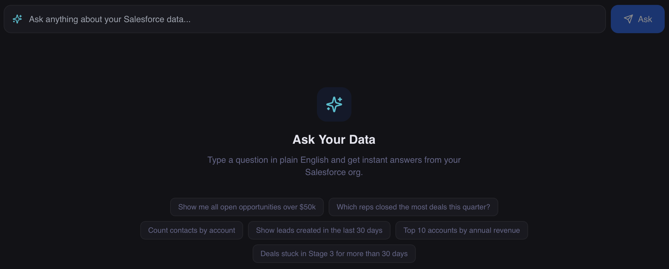 No SOQL knowledge needed. Just type what you want to know and get instant results.