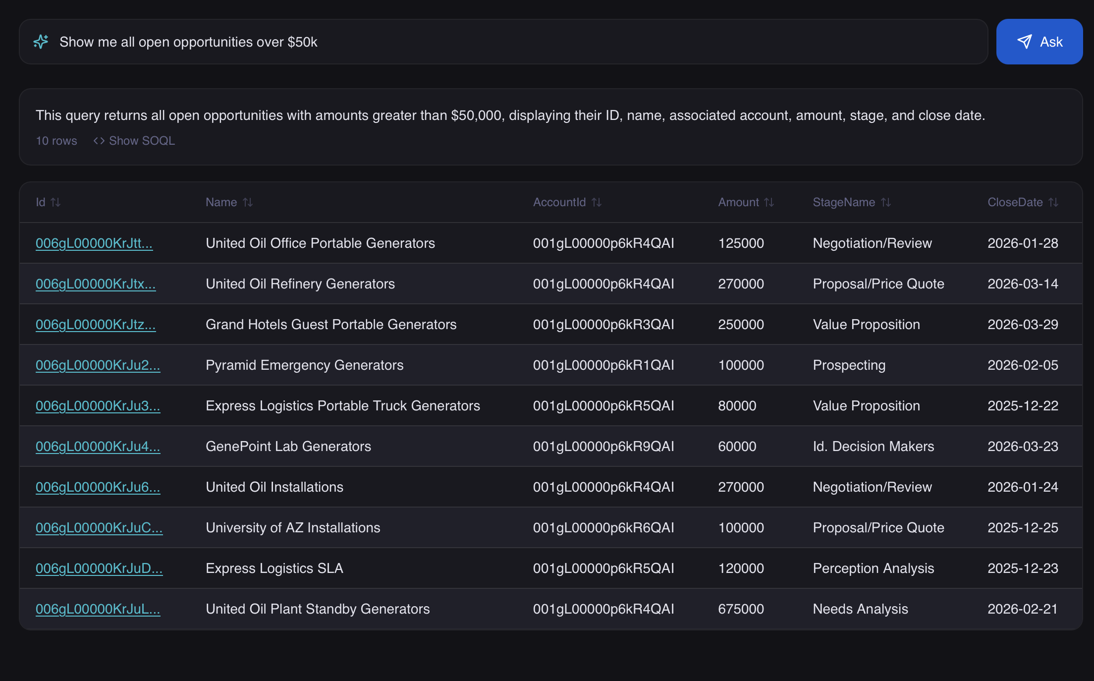 Claude translates your question into optimized SOQL using your org's actual schema.