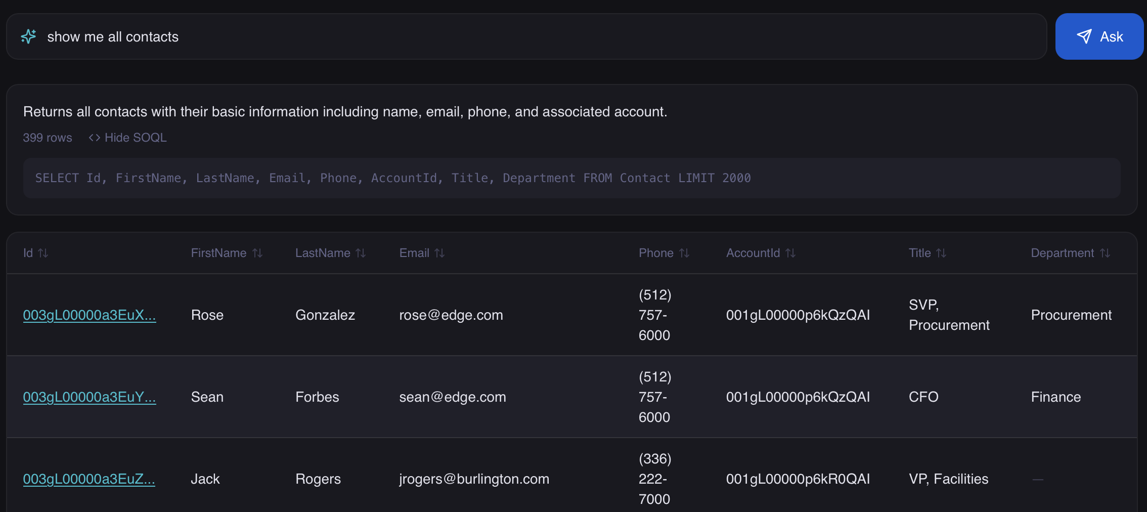 Claude AI converts your question into an optimized SOQL query — visible and transparent.